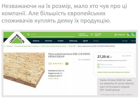 - Продукти, вироблені цими гігантськими компаніями, потенційно заплямовані українською деревиною незаконного походження, можна знайти в продажу по всьому ЄС, в тому числі у філіях найбільших мереж DIY («Do It Yourself» — «зроби це сам»), меблевих магазинів і супермаркетів на континенті.