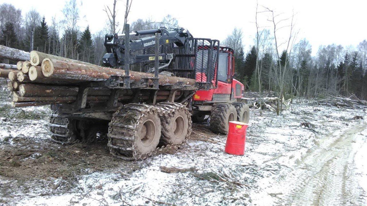 Там, где по краям вырубки смешанный лес сменяется темно-зеленым ельником, не вывезенных штабелей больше всего. Стоящий рядом на приколе форвардер «Комацу», объясняет, откуда такая «японская» скорость вырубки. Этот лесозаготовительный комбайн подбирает спиленный ствол, обрубает сучья, кряжует, и грузит готовое бревно на прицеп.