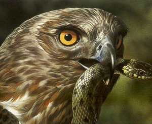 Зоркий тренированный глаз этой птицы способен с высоты разглядеть не только змею, но даже маленького змееныша.