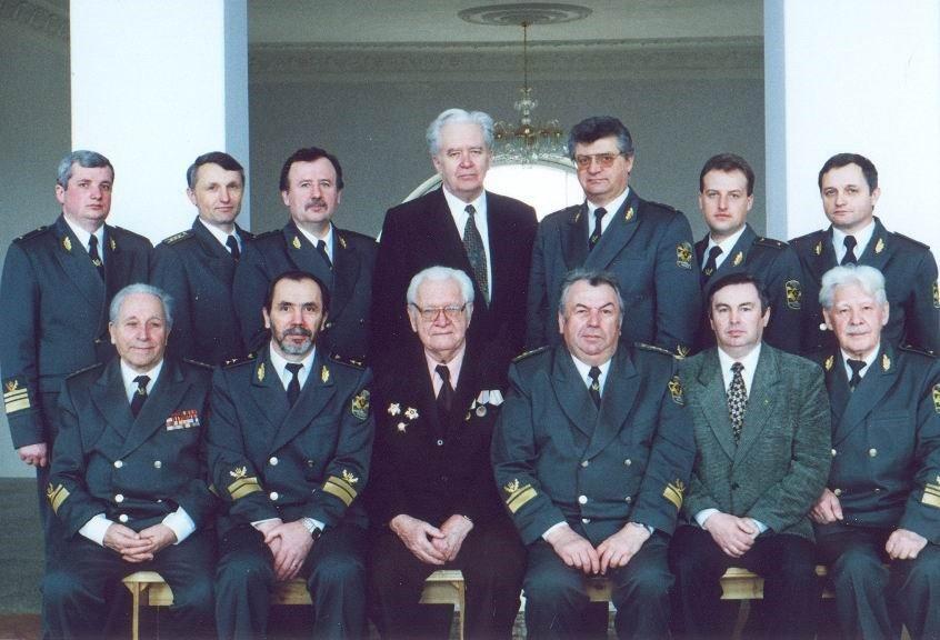 Декани та їхні заступники різних років, зліва направо – сидять: доц. П. І. Герасименко, проф. В. М. Маурер, доц. Г. В. Дубінін, доц. В. М. Портной, проф. А. А. Строчинський, доц. В. Є. Свириденко; стоять: доц. С. М. Дударець, доц. В. М. Малюга, доц. Б. І. Новак, доц. О. В. Поляков, доц. О. Г. Бабіч, доц. С. Б. Ковалевський, проф. В. Ю. Юхновський (фото 1999 р.)