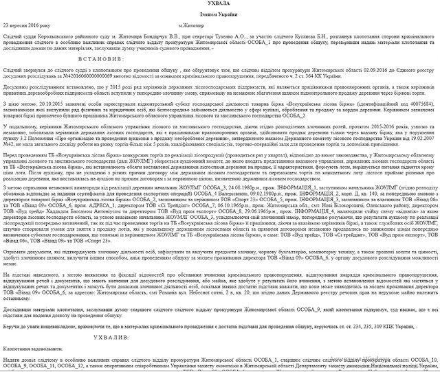 Ще в 2015 році досудовим розслідуванням прокуратури Житомирської області було встановлено, що “ряд керівників державних лісогосподарських підприємств, а також ряд керівників приватних деревообробних підприємств вступили у злочинну змову, спрямовану на незаконне збагачення шляхом підконтрольного продажу деревини через біржові торги” (текст ухвали 23.09.2016 Корольовського районного суду м. Житомира, за досудовим розслідуванням №42016060000000069). Що це значить. Відповідно до ухвали, ці особи зареєстрували підконтрольний і керований ними орган – товарну біржу “Всеукраїнська лісова біржа”, яка мала право купувати та продавати, в тому числі і за кордон, деревину. Далі текст ухвали, бо додати нам нічого, настільки все зрозуміло: