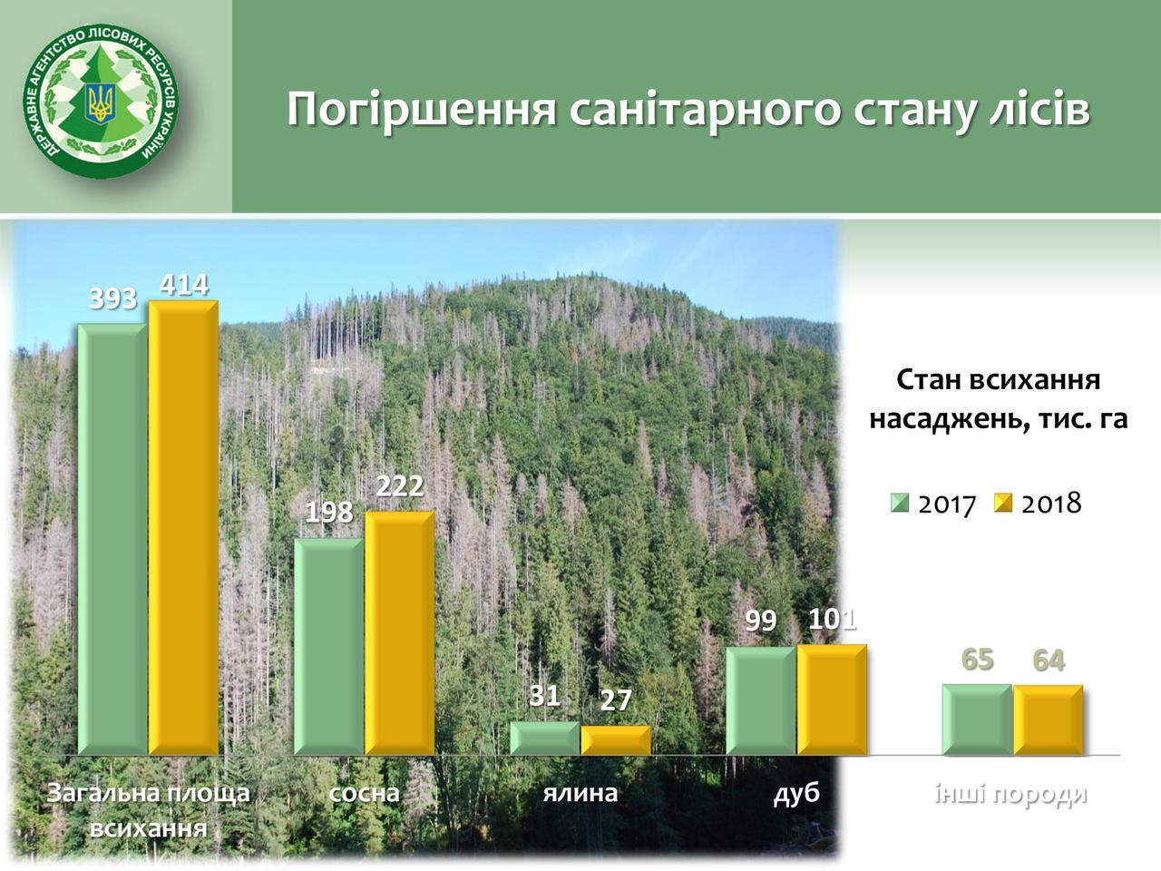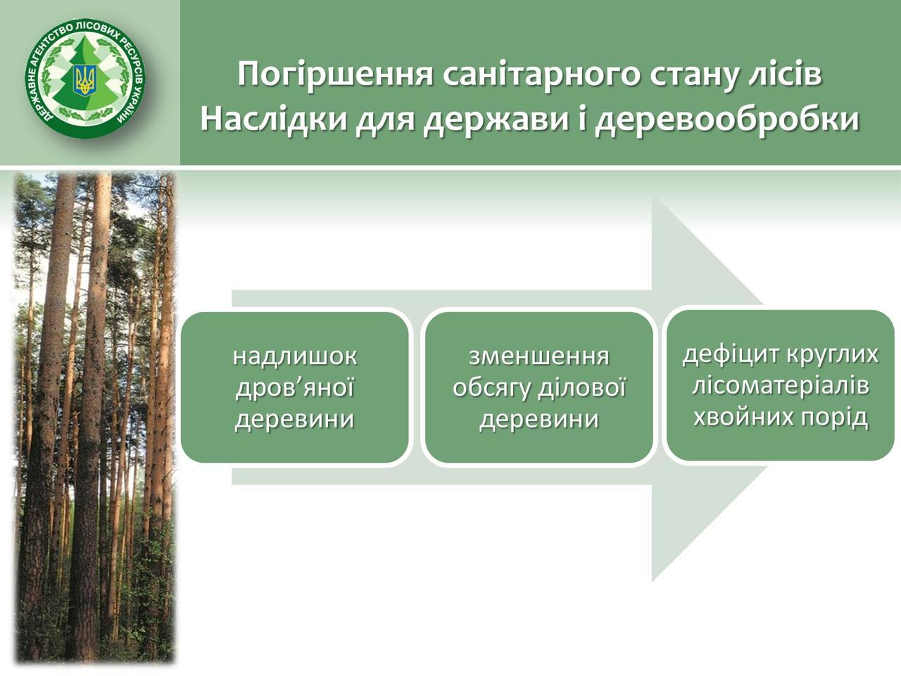 Сьогодні в залі є багато представників деревообробної галузі і ми почуємо їхню точку зору пізніше. Проблема погіршення санітарного стану лісів та несвоєчасність проведення санітарних рубок є не лише проблемою лісівників, а й у найближчому майбутньому проблемою деревообробного сектору. Нагадаю, що Держлісагентство останні два роки на всіх рівнях намагається провести внесення змін до Санітарних правил в лісах України та інші нормативно-правові документи, які регулюють проведення санітарно-оздоровчих заходів в лісах, але до цього часу питання є невирішеним.