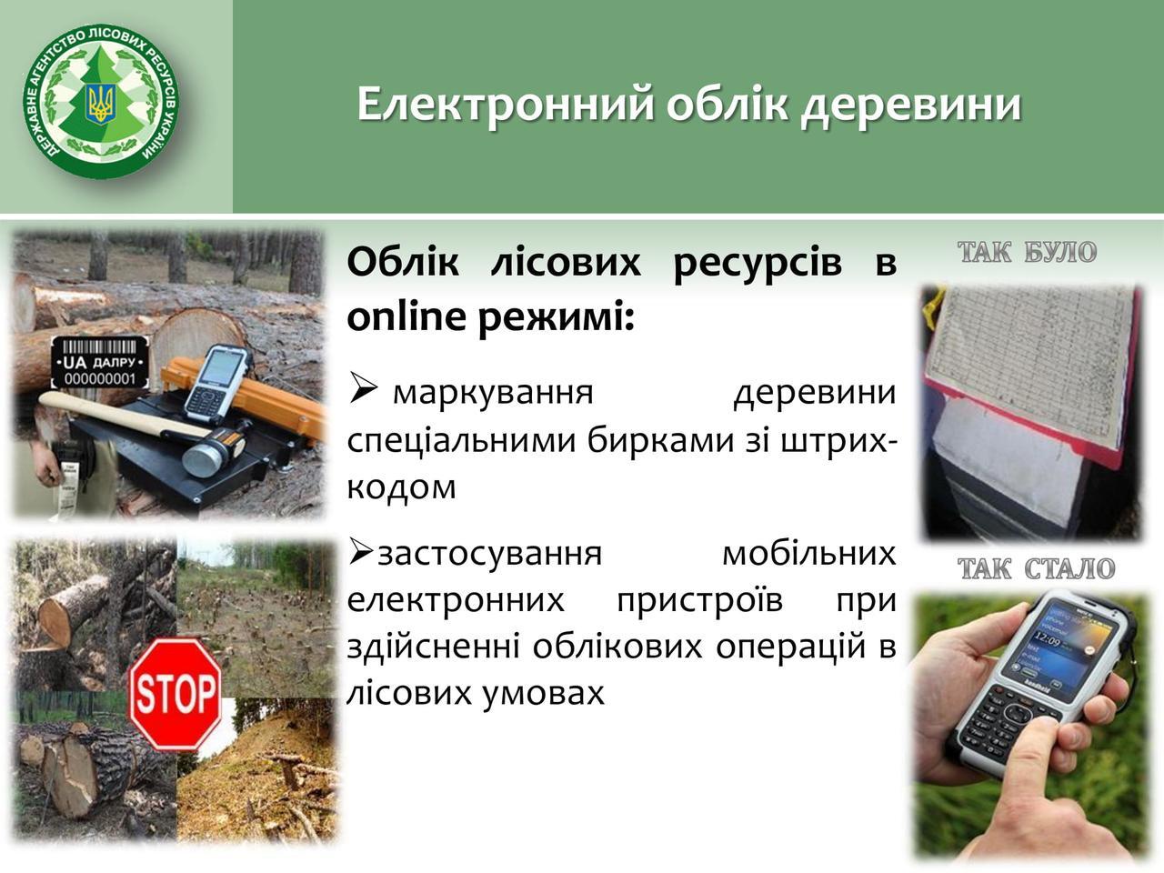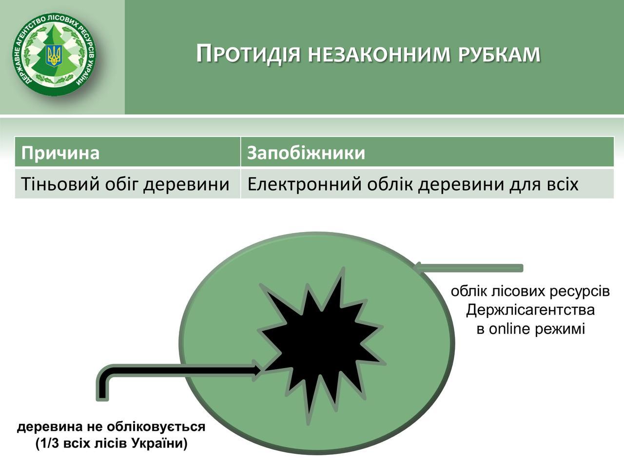 Наш проект нормативно-правового акту передбачає запровадження системи електронного обліку деревини для всіх постійних лісокористувачів як основного інструменту моніторингу внутрішнього споживання. Це не перша спроба Держлісагентства у запровадженні електронного обліку деревини для всіх лісокористувачів. Попередній проект постанови Кабінету Міністрів України був схвалений урядовим комітетом, але не був поданий Мінагрополітики на розгляд Уряду. Ще раз нагадую, сьогодні всі державні лісогосподарські підприємства, які координуються Держлісагентством, підключені до єдиної системи електронного обліку деревини, але 27% постійних лісокористувачів не підключені до системи, що дає можливість маніпулювання з документами для тих, хто задіяний в нелегальному обігу деревини.