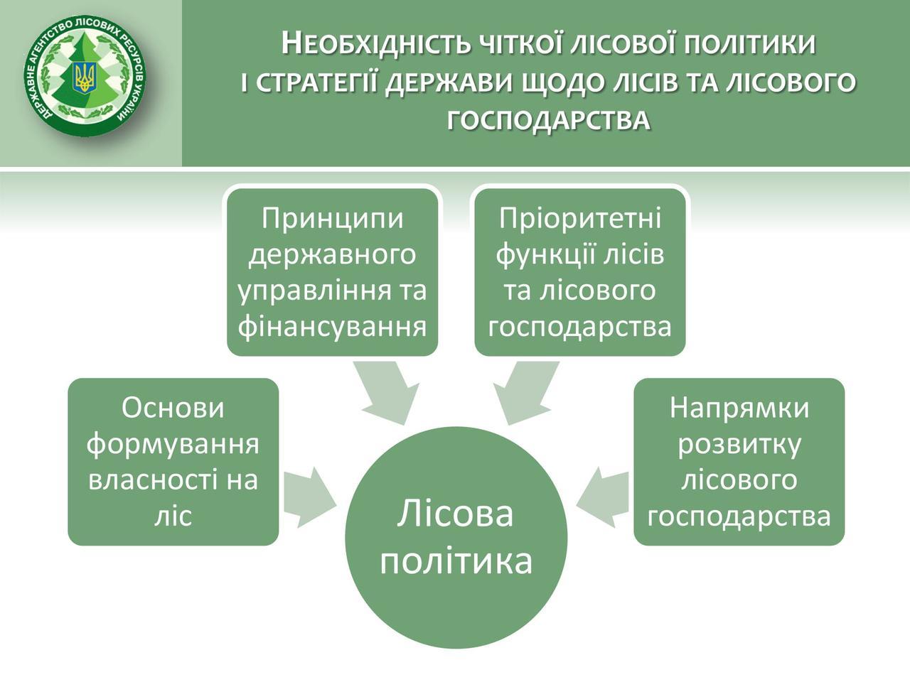 Протягом довгого періоду часу лісова галузь була закритою від суспільства. І суспільство не цікавило яким чином вона розвивається. Але останнім часом ми бачимо велику кількість не фахових та суперечливих рішень, які можуть призвести до руйнації та дестабілізації надважливої галузі економіки. У цій ситуації нам дуже необхідно визначення чіткої лісової політики, тобто стратегічного бачення держави щодо лісів та лісового господарства. Якими повинні бути правила формування власності на ліс, принципи державного управління та фінансування, які пріоритетні функції лісів та лісового господарства тощо. На всі ці та інші питання повинна відповідати лісова політика держави.