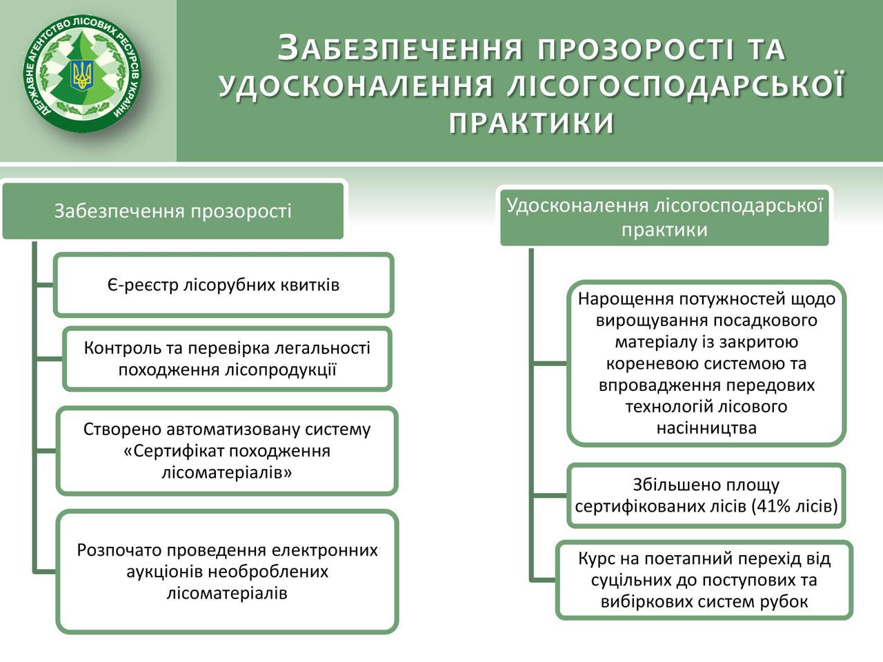 Держлісагентство відкрило для суспільства реєстри лісорубних квитків, які видаються для здійснення рубок у лісах, інформацію щодо сертифікованих лісів, можна ознайомитися з планами лісонасаджень лісогосподарських підприємств, які належать до сфери управління Держлісагентства.