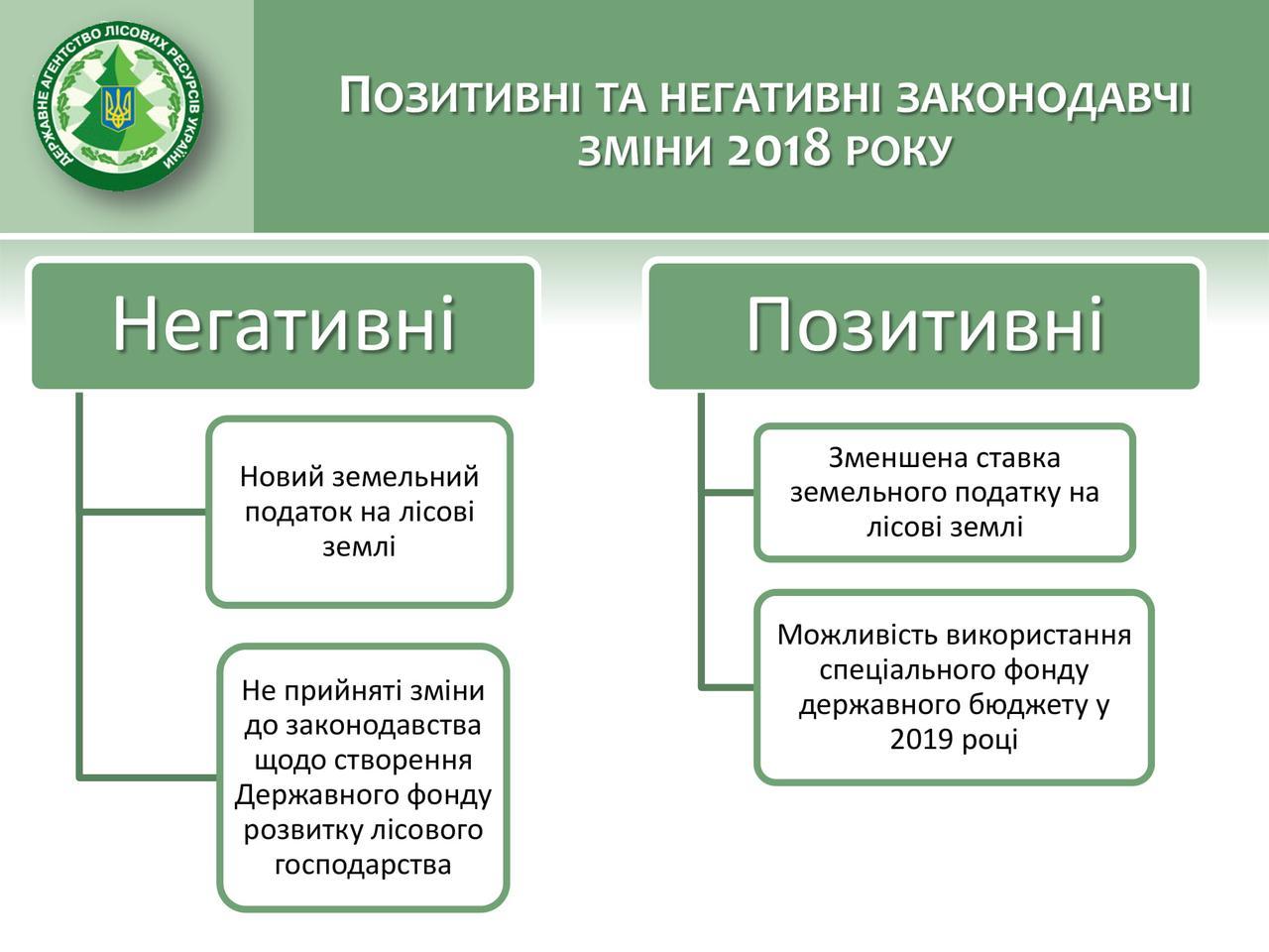 Окрім того, необхідно зазначити і вплив на галузь законодавчих змін. Загалом 2018 рік був і ризикованим, і позитивним в цьому плані. Влітку, несподівано для всієї галузі, був введений новий земельний податок на лісові землі. Цей податок був прописаний в змінах до Податкового кодексу щодо сімейних фермерських господарств. Нововведення могло призвести до банкрутства майже всіх лісогосподарських підприємств.