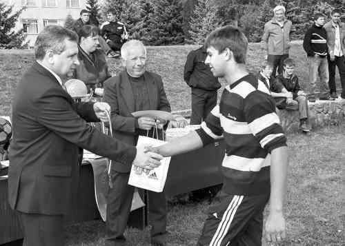 На фото: Директор Лубенського лісотехнічного коледжу Роман Сендзюк (ліворуч) та колишній директор цього навчального закладу Микола Федько вручають нагороди переможцям Олімпійського дня спорту.