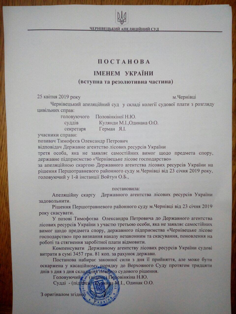 Спасибо за правдивую информацию. В дополнение замечу, что и.о. назначен главный лесничий. Поздравляю Гослесагентство с выигрышем битвы и одновременно соболезную, так как понимаю, что это “не дешево дается” и не обеспечивает победы в войне… Не знаю решиться ли Тимофеев на кассацию, но напоминаю , что именно на этом этапе у Гослесагентства выиграл Роман Олейник… Поздравляю юридические и кадровые службы Гослесагентсва… хотя понимаю что их работа утомительна: на финише можно устать, опустить руки и даже присесть… по-совокупности…
