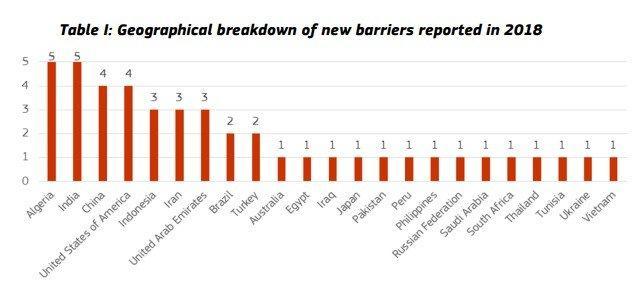 Росія посіла друге місце з 34 бар’єрами. Торгівельна напруга між ЄС та США також збільшилася торік до 23 бар’єрів – на чотири більше, ніж 2017 року, що вплинуло на експорт ЄС на суму 6,8 млрд євро.