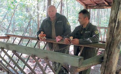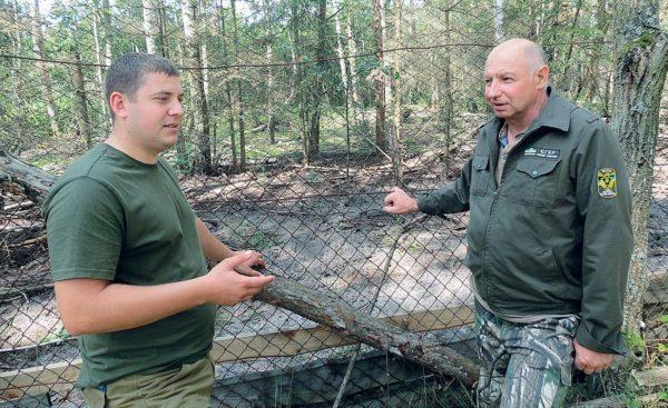 Єгері Володимир Кошмак і Микола Олішевський оглядають стан біотехнічних споруд у лісі