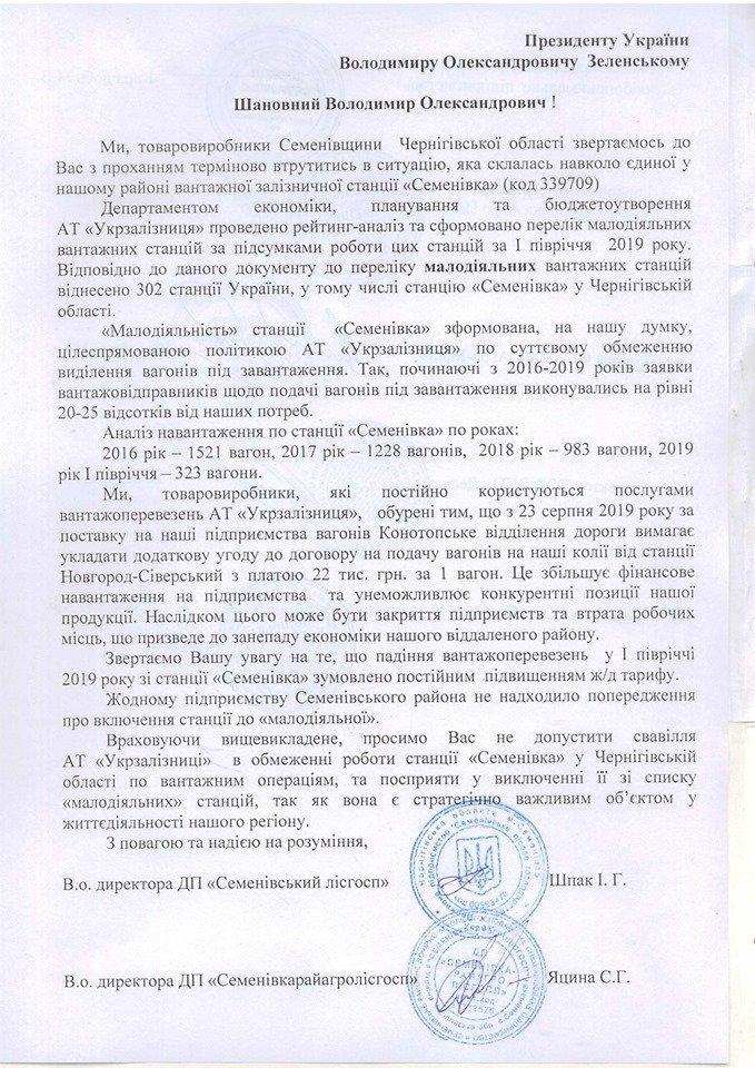 Керівники лісогосподарських та сільськогосподарських підприємств Семенівського району Чернігівської області, звернулись до Президента України Зеленського В.О. відносно дій монополіста у сфері вантажних перевезень АТ«Укрзалізниця» , що направлені на підрив економічного розвитку Семенівського району Чернігівській області.