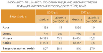 Що стосується дикого кабана, то, як всім відомо, внаслідок епідемії африканської чуми свиней у багатьох районах проводиться його депопуляція. У зв’язку з цим, чисельність кабана зменшилася на 836 голів у порівнянні з 2016 роком.