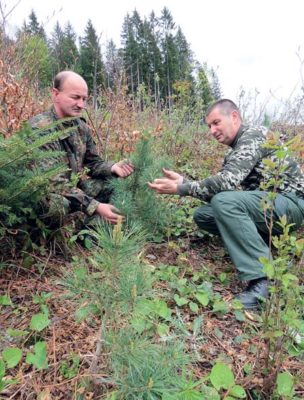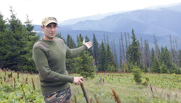 На зміну чистим ослабленим ялинникам у гори приходять змішані ліси на основі корінних та інтродукованих деревних порід. Директор Рахівського лісгоспу Володимир Приступа (праворуч) і лісничий Говерлянського лісництва Степан Папарига задоволені: кедр європейський на висоті 1100 м над рівнем моря почуває себе добре