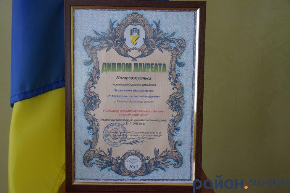 За підсумками проведеного конкурсу первинну профспілкову організацію ДП «Маневицьке лісове господарство» нагородили Дипломом лауреата Всеукраїнського конкурсу у номінації кращий колективний договір у виробничій сфері.