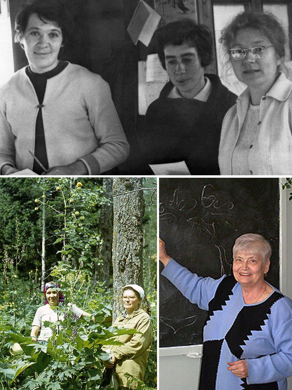 Рисунок 2. Коллеги О.В. Смирновой (начало). Вверху. О.В. Смирнова с ученицами Алексея Александровича Уранова – с Ермаковой Инной Михайловной (научный сотрудник ПБЛ МГПИ им. В.И. Ленина) и с Григорьевой Ниной Михайловной (преподаватель кафедры ботаники МГПИ, справа) в 1974 году. Слева внизу. Среди лесного высокотравья с Татьяной Ивановной Серебряковой (зав. кафедрой ботаники МГПИ с 1974 по 1986 гг.) во время поездки на Салаир (Гурьевский район Кемеровской области) в 1982 году. Фотография М.А. Бариновой. Справа внизу. Александра Александровна Чистякова (к.б.н., профессор кафедры ботаники, физиологии и биохимии растений Пензенского университета), с которой написаны основные работы по популяционной организации лесных сообществ
