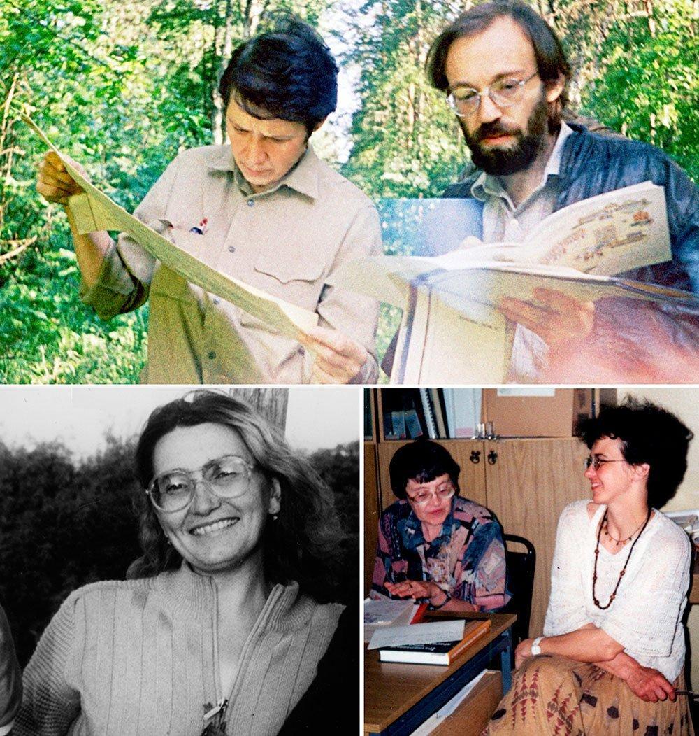 Рисунок 3. Коллеги О.В. Смирновой (продолжение). Вверху. С Попадюком Романом Васильевичем (научный сотрудник ПБЛ МГПИ) во время экспедиции в Приокско-Террасном заповеднике в 1990 году. Фотография М.А. Бариновой. Внизу слева. Торопова Наталья Александровна (к.б.н., доцент кафедры ботаники Тамбовского пединститута) в Каневском заповеднике (Черкасская обл., Украина) в 1983 году. Внизу справа. Коллеги О.В. Смирновой обсуждают научные планы в лаборатории Моделирования экосистем ИФХиБПП РАН (г. Пущино). Слева – Заугольнова Людмила Борисовна (д.б.н., г.н.с. ЦЭПЛ РАН, г. Москва), справа – Ханина Лариса Геннадьевна (к.б.н., доцент, зав. лабораторией Вычислительной экологии ИМПБ РАН, г. Пущино). 1999 г.