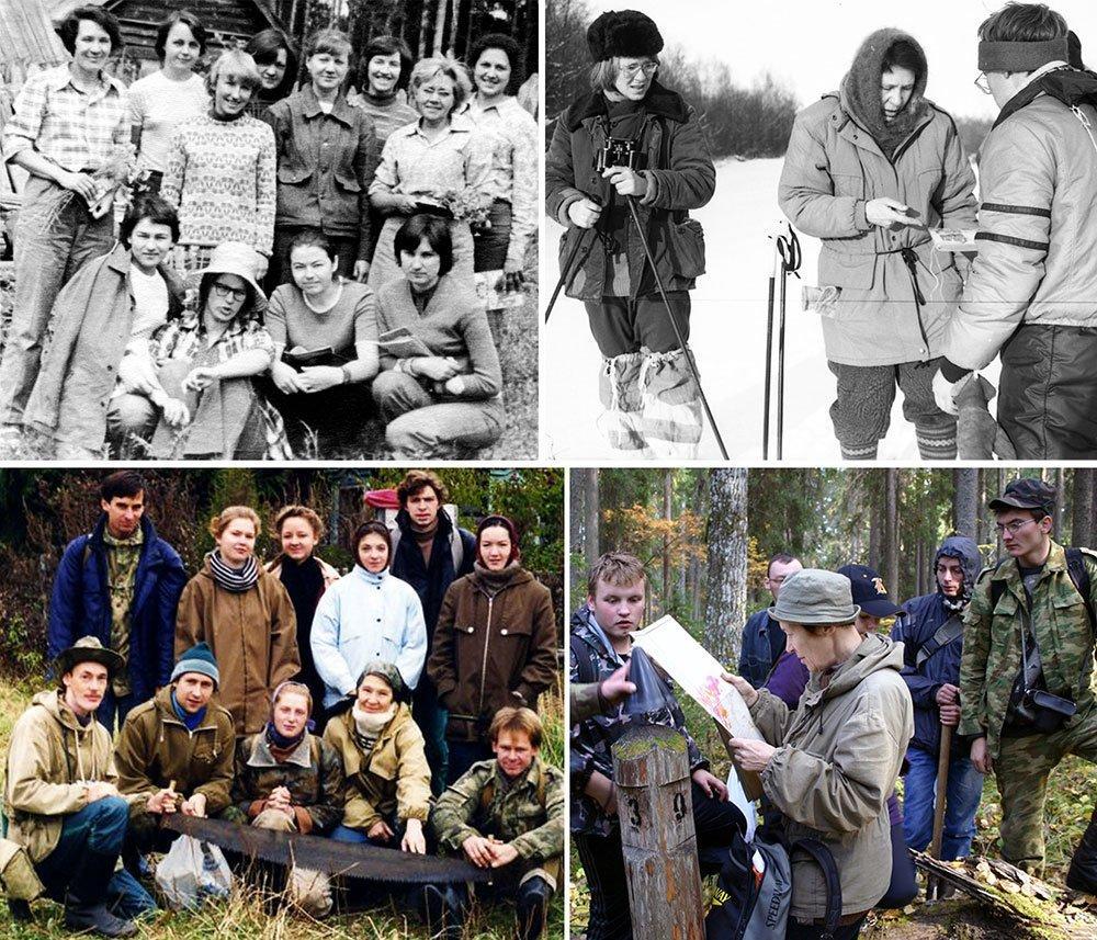 Рисунок 4. Полевые практики. Вверху слева. Летняя практика со студентами 2 курса МГПИ в 1977 году с О.В. Смирновой (к.б.н., стоит слева) и с Мариной Петровной Соловьевой (доцент, к.б.н., стоит вторая справа) в Теллермановском лесничестве (Воронежская обл.). Вверху справа. Зимняя практика с магистрантами Пущинского ун-та в Центрально-Лесном заповеднике в 1994 году: Беляков Константин Викторович (магистрант, слева), Смирнова О.В., Романов Михаил Сергеевич (магистрант, справа). Фотография М.А. Бариновой. Внизу слева. Осенняя практика с магистрантами первого курса Пущинского ун-та в заповеднике «Калужские засеки» в 1996 году. Стоят слева направо: Коротков Владимир Николаевич (к.б.н., с.н.с. Всероссийского научно-исследовательского центра по лесным ресурсам), Синотова Оксана (магистрантка), Мищенко Марина (магистрантка), Тарасова Лариса (магистрантка), Бобровский Максим Викторович (ст. преподаватель). Сидят слева направо: Курицын Александр (магистрант), Тимофеев Владимир (магистрант), Агафонова Александра (аспирантка), Смирнова О.В., Егоров Алексей (магистрант). Внизу справа. Осенняя практика с магистрантами первого курса Пущинского ун-та в национальном парке «Русский север» в 2005 году. Слева направо: Алейников Алексей, Харитоненков Максим, Смирнова О.В., Кобозева Екатерина, Шанин Владимир, Горнов Алексей. Фотография М.В. Бобровского.