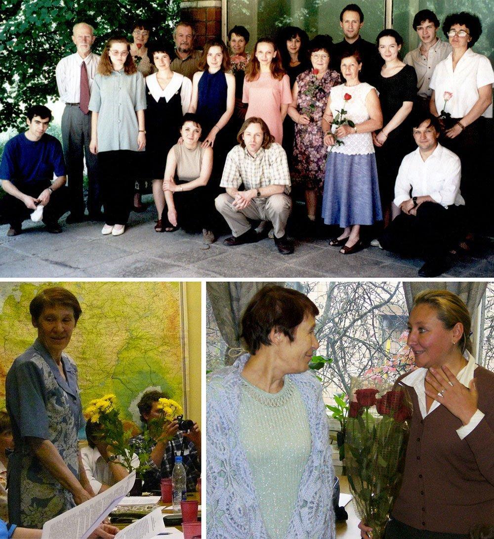 Рисунок 5. Кафедра Системной экологии Учебного центра математической биологии ПущГУ. Вверху. После защиты магистерских работ в июле 1998 года. Сидят слева направо: Рейф Виталий Эдгарович (магистр), Сарычева Елена Петровна (аспирантка), Цыпляновский Андрей Михайлович (аспирант), Быховец Сергей Станиславович (ст. преподаватель). Стоят (первый ряд, слева направо): Синотова Оксана Александровна (магистр), Рубашко Галина Евгеньевна (магистр), Есипова Елена Сергеевна (магистр), Диденко Елена Геннадьевна (магистр), Медведева Ирина Федоровна (зав. учебной частью), Валентина Сергеевна (лаборант), Турубанова Светлана Афанасьевна (магистр), Ханина Лариса Геннадьевна (к.б.н., доцент). Стоят (второй ряд, слева направо): Павлов Вадим Николаевич (д.б.н., профессор, председатель ГЭК), Паленова Мария Михайловна (к.б.н., доцент), Комаров Александр Сергеевич (к.б.н., доцент, зав. кафедрой), Смирнова О.В. (д.б.н., профессор), Манукянц Анна Валерьевна (магистр), Тимофеев Владимир Викторович (магистр), Бобровский Максим Викторович (ст. преподаватель). Внизу слева. Выступление О.В. Смирновой на защите магистерских работ 18 июня 2007 года. Внизу справа. Смирнова О.В. и Леонова Наталья Алексеевна (к.б.н., доцент кафедры ботаники, физиологии и биохимии растений Пензенского университета) после научного семинара 11 октября 1996 года на кафедре Системной экологии