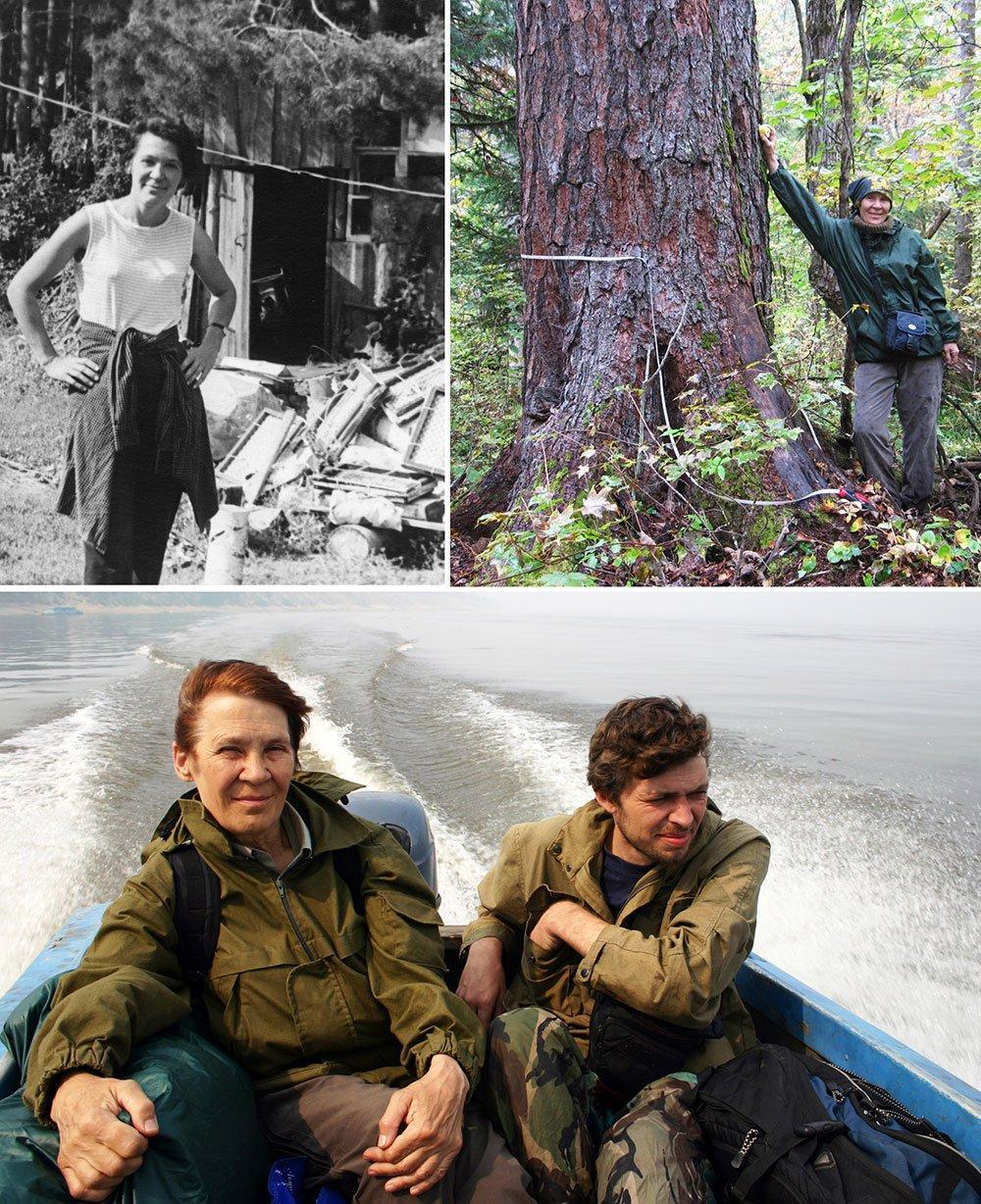 Рисунок 7. Экспедиции (продолжение 1). Вверху слева. О.В. Смирнова в Воронежском заповеднике в 1974 году во время изучения структуры травяного покрова широколиственных лесов. Вверху справа. О.В. Смирнова у кедра корейского в Уссурийском заповеднике (Дальний Восток) в 2008 году. Фотография В.Н. Короткова. Внизу. Обследование долины реки Подкаменная Тунгуска в июле 2006 года. Эвенкийский район Красноярского края, центральная часть Среднесибирского плоскогорья. Смирнова О.В. и Бобровский Максим Викторович (к.б.н., доцент кафедры Системной экологии ПущГУ).