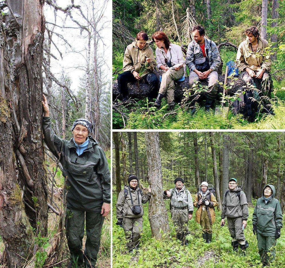 Рисунок 8. Экспедиции (продолжение 2). Слева. О.В. Смирнова в Висимском заповеднике около рябины обыкновенной в мае 2019 года. Фотография А.П. Гераськиной. Вверху. В Печоро-Илычском заповеднике в августе 2003 года. Слева направо: О.В. Смирнова, Елена Черненькова – сотрудница WWF, Сергей Паутов – сотрудник Омского технологического ун-та, Максим Бобровский – ст. преподаватель ПущГУ. Фотография В.Н. Короткова. Внизу. В охранной зоне Висимского заповедника во время обследования уникального хвойно-широколиственного леса с липой сердцевидной и вязом шершавым в мае 2019 года. Слева направо: Гераськина Анна Петровна – к.б.н., зоолог ЦЭПЛ РАН, Сибгатуллин Рустам Зинатович – геоботаник заповедника, Беляева Наталья Вадимовна – фенолог заповедника, Шилов Денис Сергеевич – флорист заповедника, Смирнова О.В. Фотография В.Н. Короткова.