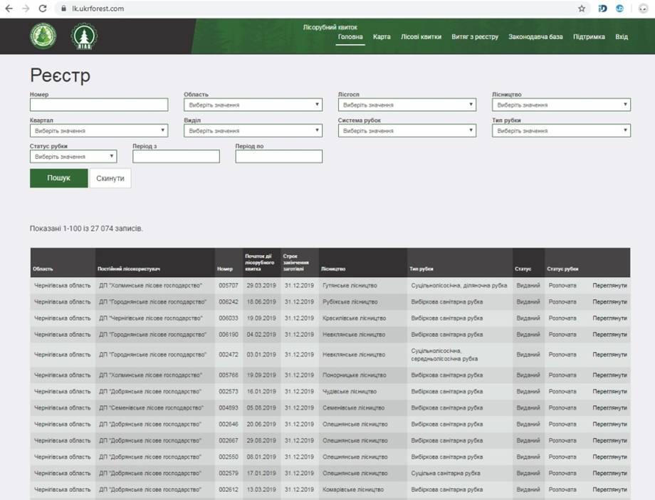 Весь перелік лісорубних квитків у форматі PDF доступний на сайті у рубриці «Витяг з реєстру».
