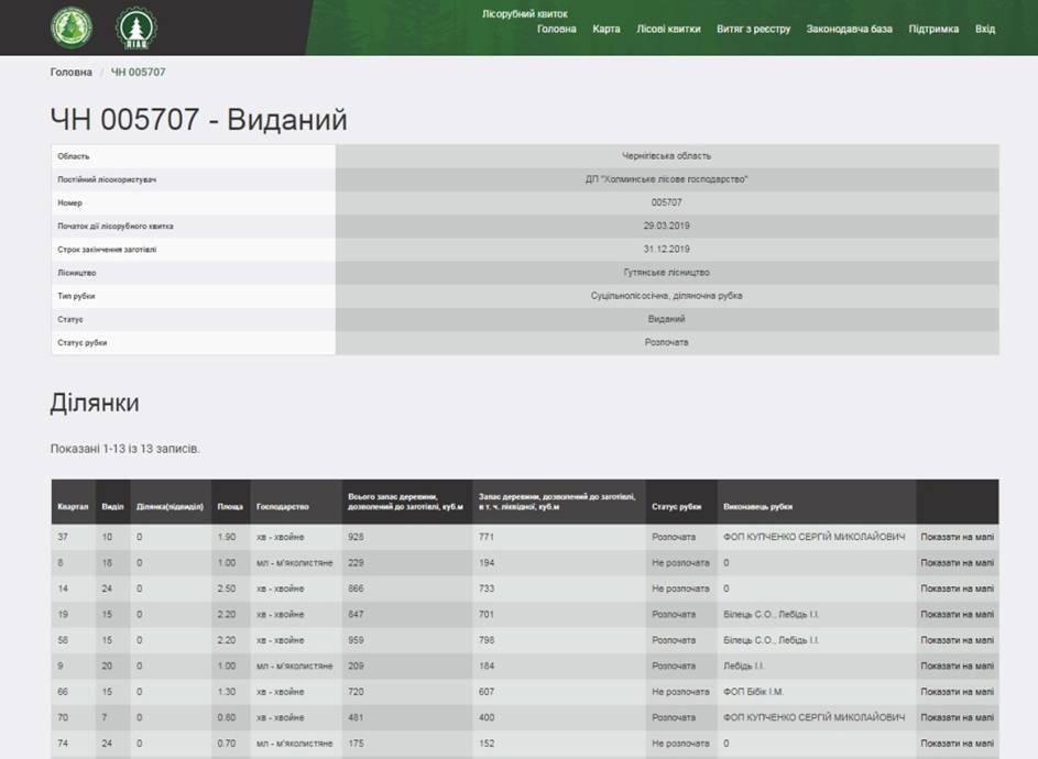 У загальному переліку можна обрати «Переглянути» та детально ознайомитися з тим чи іншим лісорубним квитком та ділянками, на яких відбувається чи відбуватиметься заготівля деревини, а також переглянути на онлайн-карті.