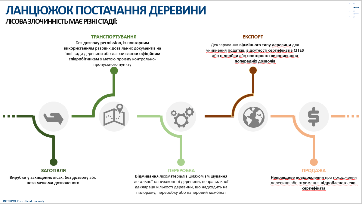 Ланцюжок постачання деревини© InterpolРезультати цієї спільної роботи слугуватимуть основою для тренувань поліції, митниці, екологічних органів, прокуратури та суддів у країнах регіону© WWF Ukraine