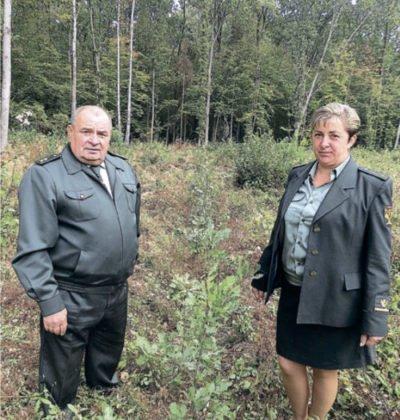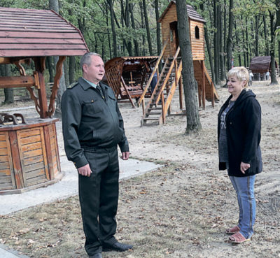 Начальник відділу лісгоспу Микола Моісєєнко і продавець «Лісовичка» Людмила Бугай на рекреаційному майданчику Чорнолозького лісництва