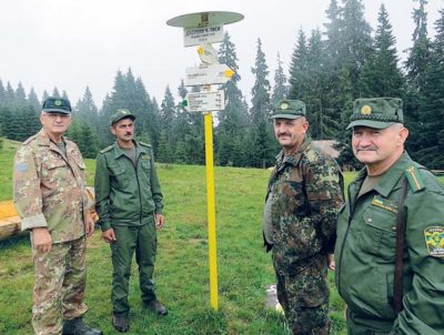 Дорога зблизила колег двохі сусідніх районів. На перевалі Околи зустрілися, щоб обговорити деякі питання боротьби з браконьєрством, директор Брустурянського ЛМГ Михайло Бігун (у центрі) та головний лісничий Іван Арович і працівники мисливського відділу Ясінянського ЛМГ Василь М. Дердюк і Василь С. Дердюк.