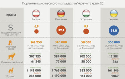 Ця країна має площу мисливських угідь у сім разів меншу за Україну, натомість щорічно там добувають у 144 рази більше оленя, у 50 разів більше козулі та у майже 10 разів більше кабанів.