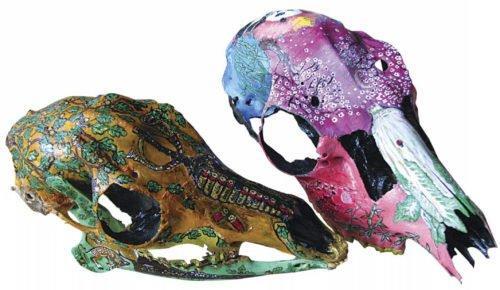 Почала я з розпису черепа маленької мавпочки. Це була моя проба пера. Перший «здобутий» мною самостійно трофей, я знайшла просто в полі. Зараз два моїх черепно-пір’яних напрямки розвиваються паралельно. Якщо джерело пір’яних матеріалів я вже знайшла, то з черепами складніше. Найчастіше мені попадаються черепи корів, були черепи козулі, лані, лисиці, вовка. Хотілося б попрацювати з яким-небудь екзотичним черепом. Але привезти його із-за кордону практично неможливо. Мій чоловік, подорожуючи Еквадором, придбав реліквії одного з місцевих племен – якісні копії черепів – ворогів цього племені. Раніше воїни цих племен носили у себе на поясі черепи переможених ними ворогів. На митниці йому довго довелося пояснювати, що це туристичні сувеніри, а не справжні голови.
