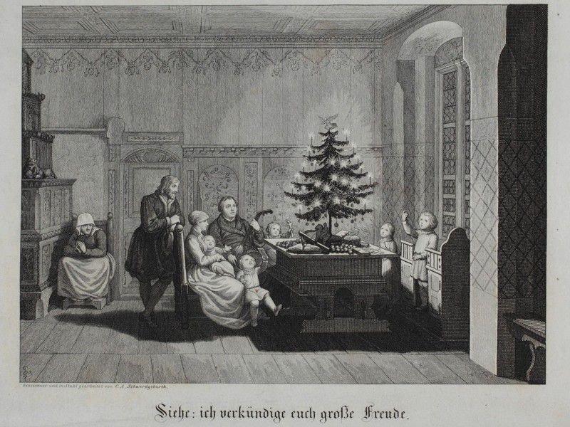 Фото: Изображение протестантского реформатора Мартина Лютера (1483-1546) как “изобретателя” рождественской елки на самом деле написана по вымышленному сюжету. . Гравюра Карла Августа Шверджбурта с 1843 года.