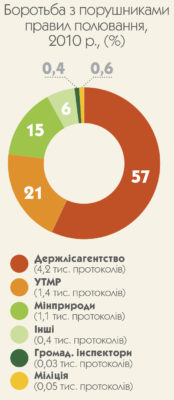 Хочу зауважити, що майже 57% (4,2 тис. протоколів) надійшли до держбюджету завдяки роботі державної лісової охорони і державних районних мисливствознавців. Натомість ефективність державної екологічної служби становила всього 15% від загальної кількості складених протоколів. І зараз, коли говорять про те, що необхідно передати контрольні функції Держлісагентства іншому відомству, яке не має досвіду охорони у цій сфері, але має брак співробітників, їх забезпечення, мають зобов’язання охороняти інші ресурси, більш важливі, на їх думку, ніж тварини та ліс, то це призведе до повної втрати контролю над всіма лісовими та мисливських угіддями України і відповідно тотального знищення їх ресурсів.