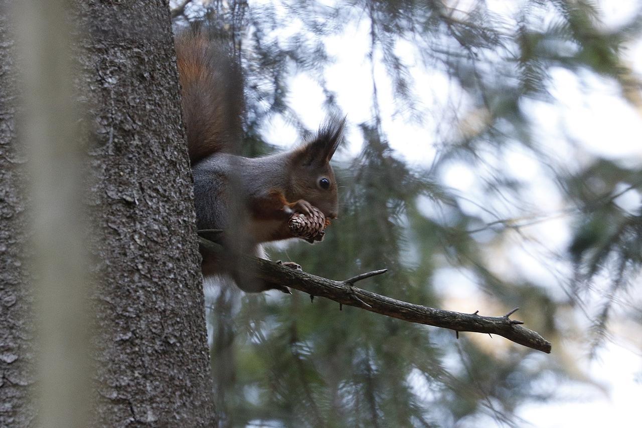 Белкина еда не в поле растет, а на густых елях висит. Сюда солнце почти не заглядывает. Но ушлая древолазка выход нашла – шишку в зубы и на с ней на сук, где посветлей. Тут и лакомится.