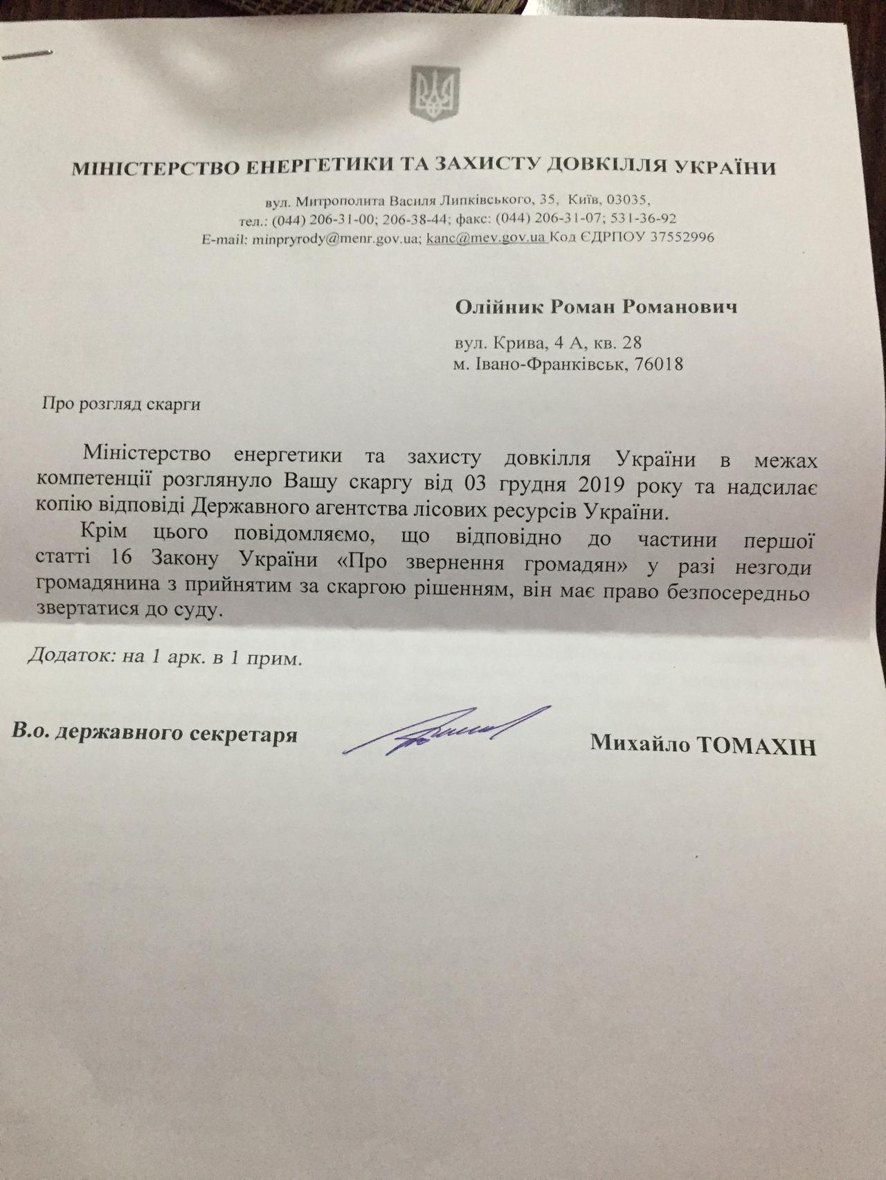 - письмо-скарга Романа Олейника Министру энергетики и защиты природы