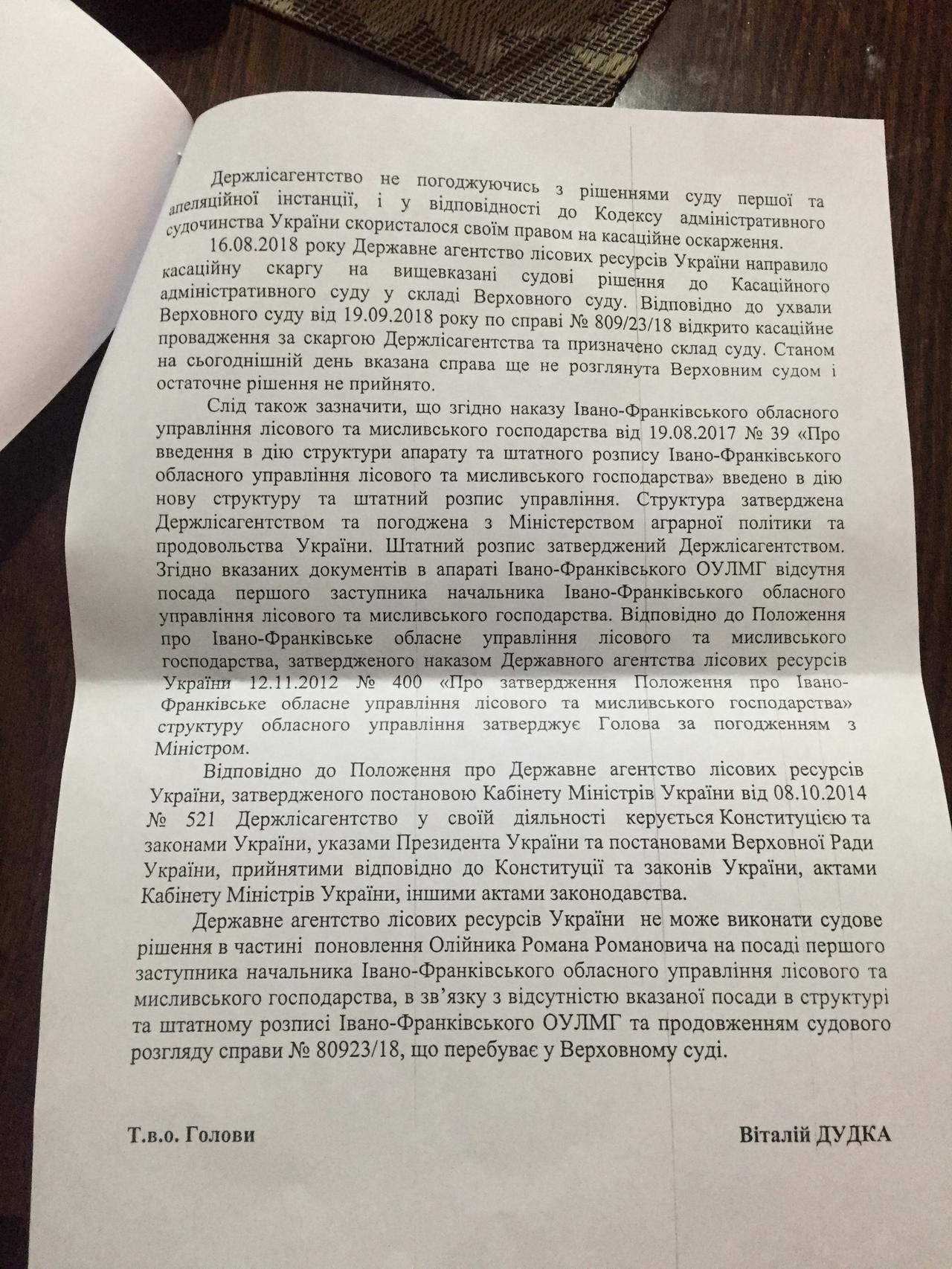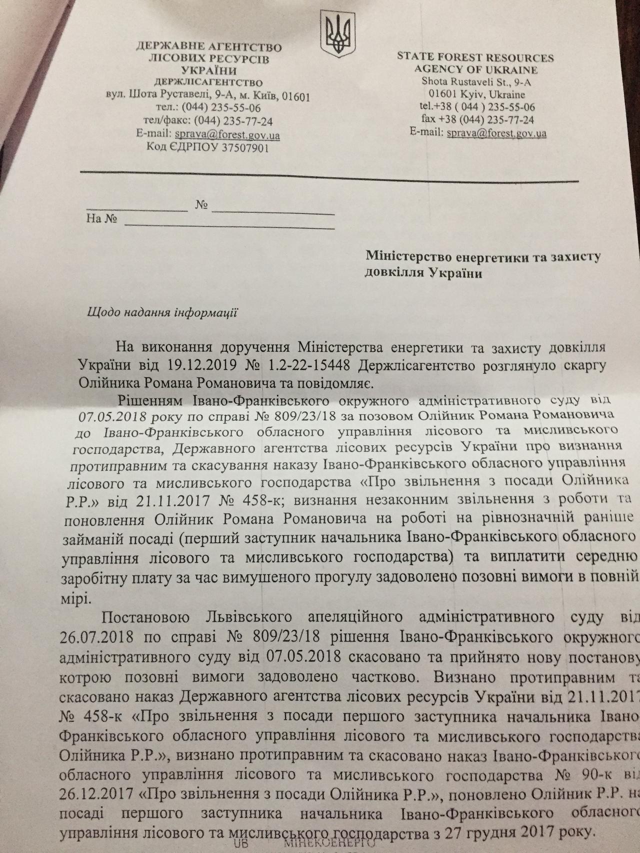 Листом Івано-Франківського обласного управління лісового та мисливського господарства від 22.08.2019 року № 11-09/80-1655 мене повідомлено, що обласне управління лісового та мисливського господарства зможе приступити до виконання постанови Львівського апеляційного адміністративного суду від 26.07.2018 року тільки після отримання наказу з Держлісагенства про призначення (поновлення) Олійника Р.Р. на роботі.