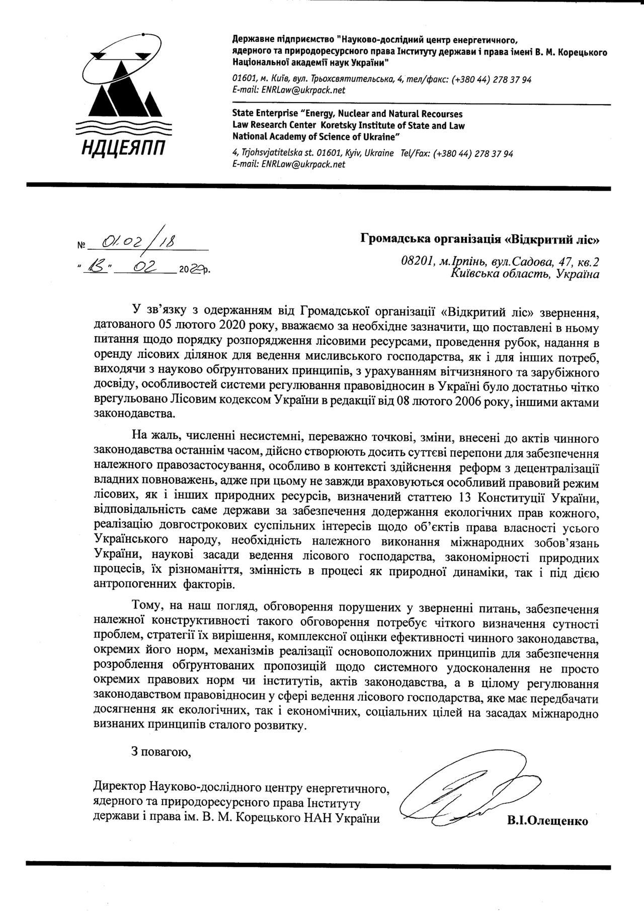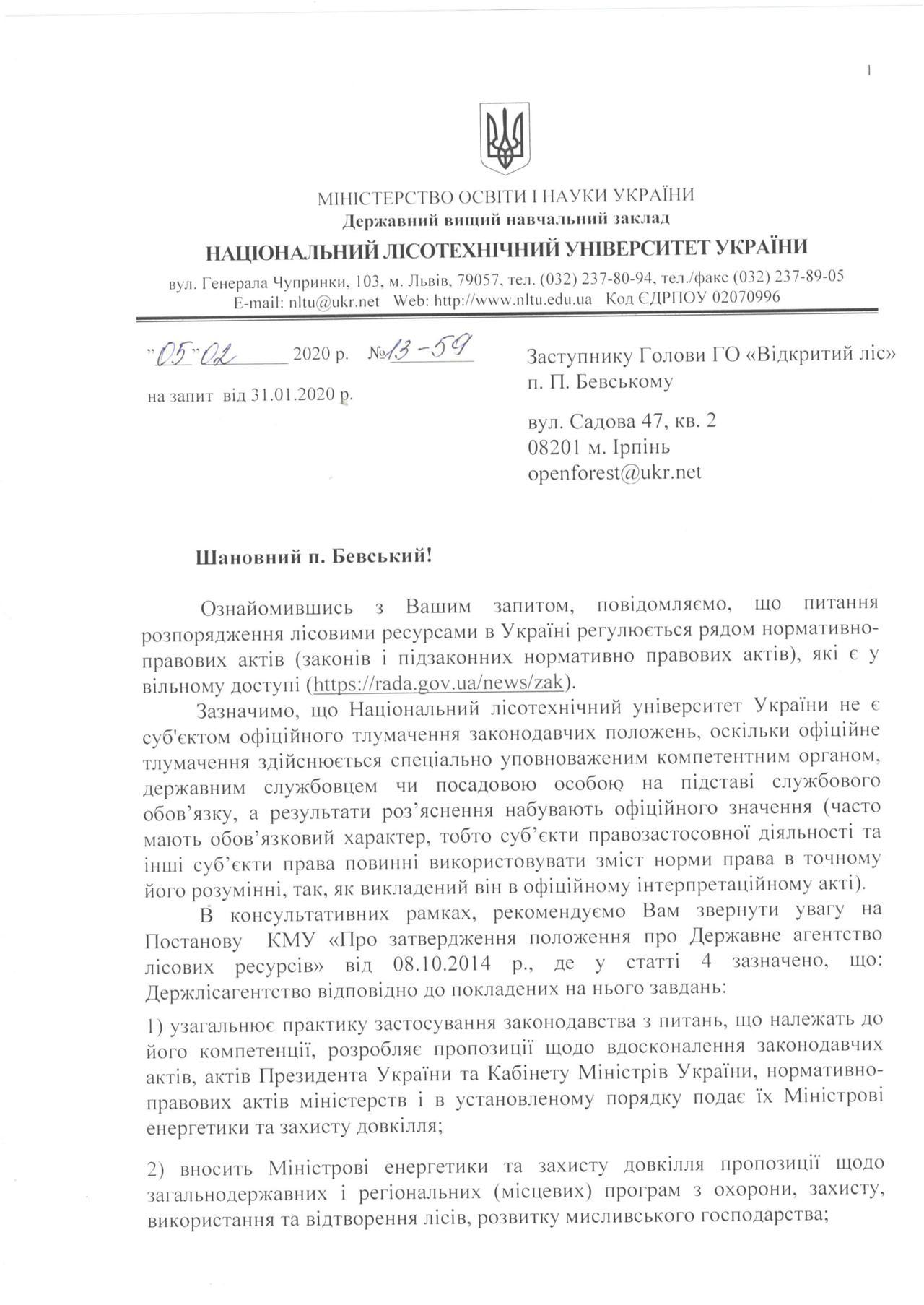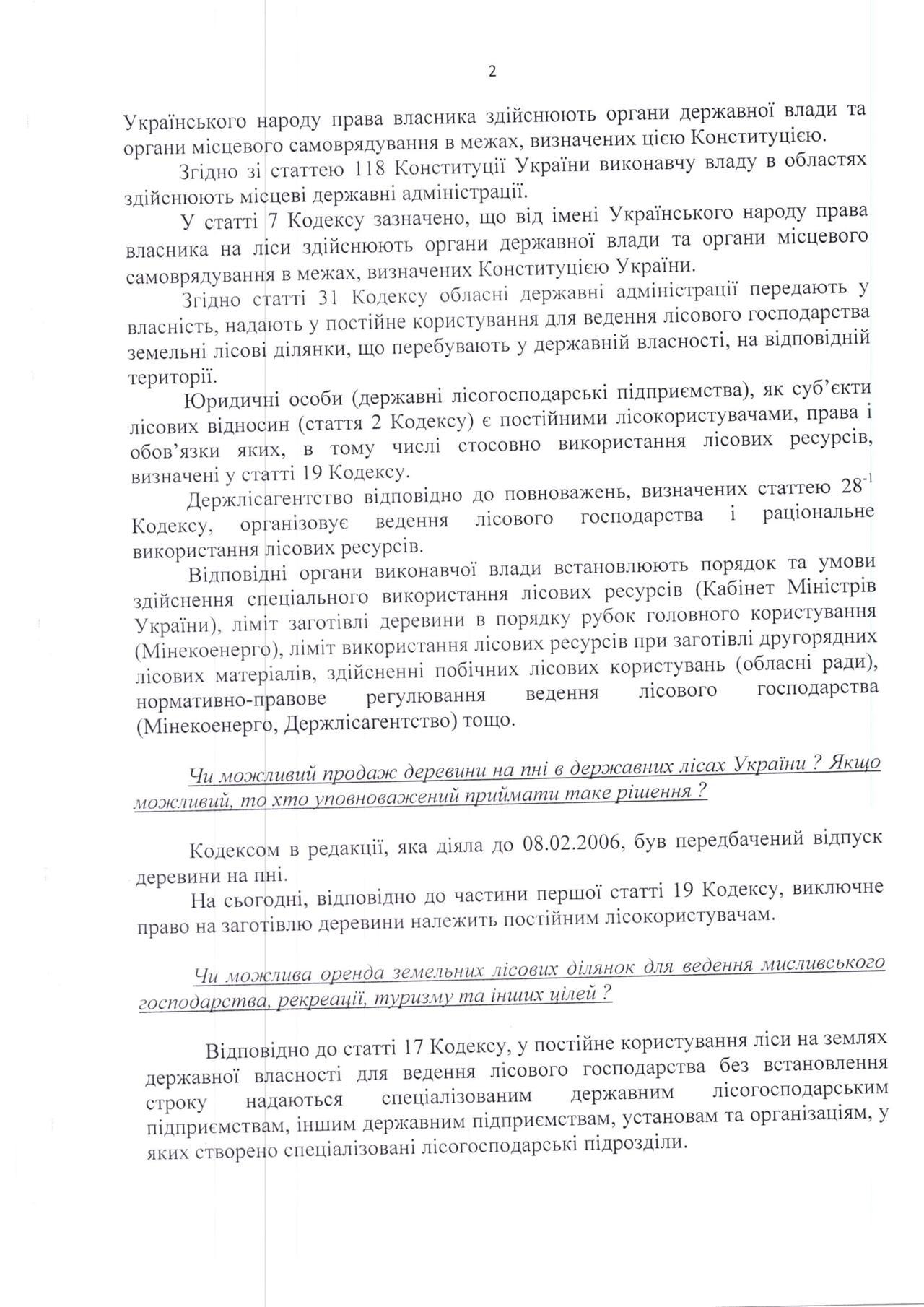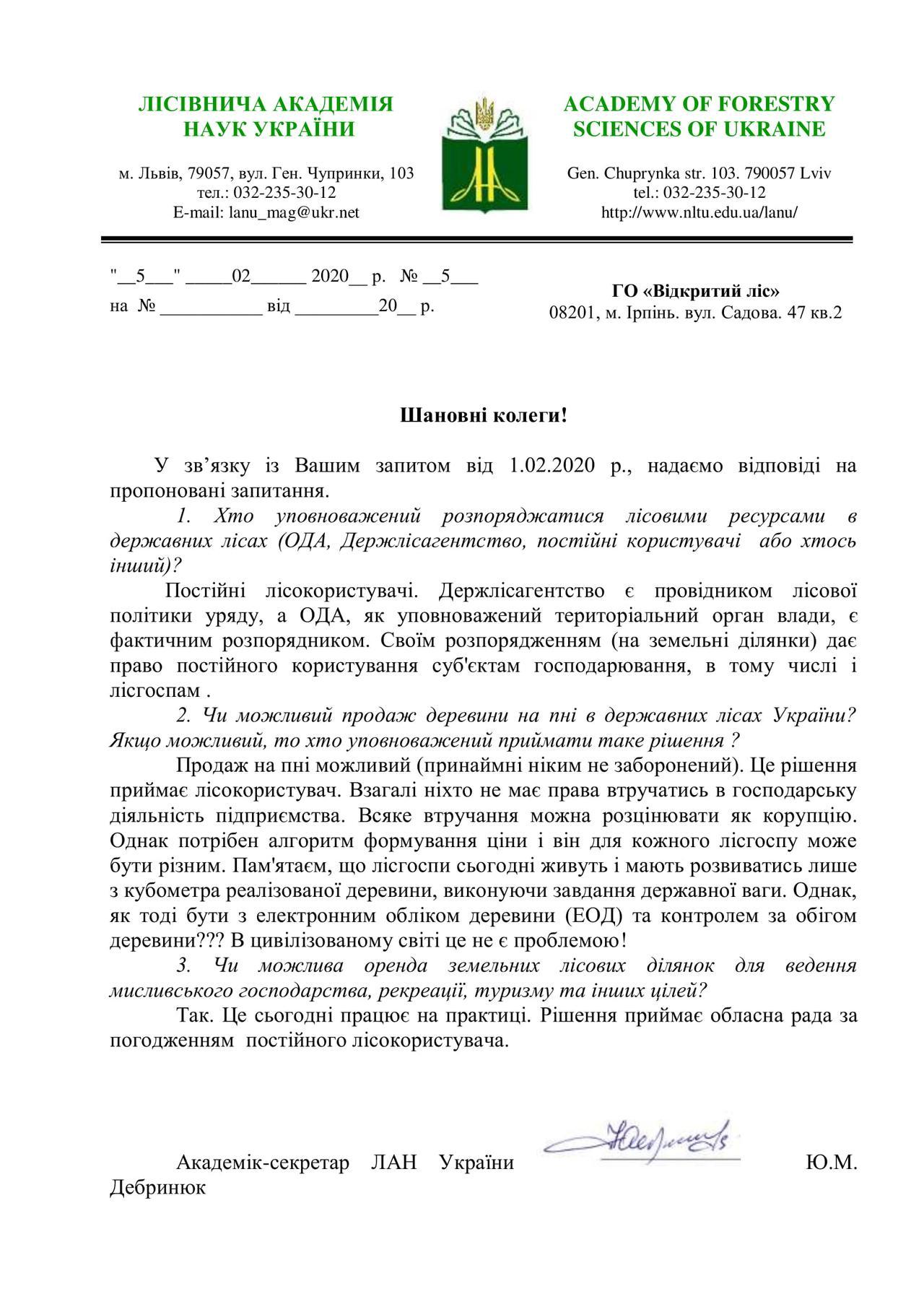 Ответы были диаметрально противоположны и мы обещали найти правильные. Для этого мы направили информационные запросы ряду профильных организаций и авторитетных экспертов. Среди организаций: представители отраслевой лесной науки (УкрНИИЛХА, Укргорлес) лесного образования (НЛТУ, НУБиП), государственного права (Институт государства и права Украины), органов власти (Министерство энергетики и защиты природы и Госкомлесагентства, а также общественная организация, объединяющая лесную элиту страны “Лесная академия”. От имени Института государства и права на наш запрос ответило Державне підприємство “Науково-дослідний центр енергетичного, ядерного та природоресурсного права Інституту держави і права імені В. М. Корецького Національної академії наук України”. К настоящему времени мы получили большинство ответов: Министерство энергетики опаздывает с ответом, ответ НУБиП отправлен почтой и ещё не дошел.