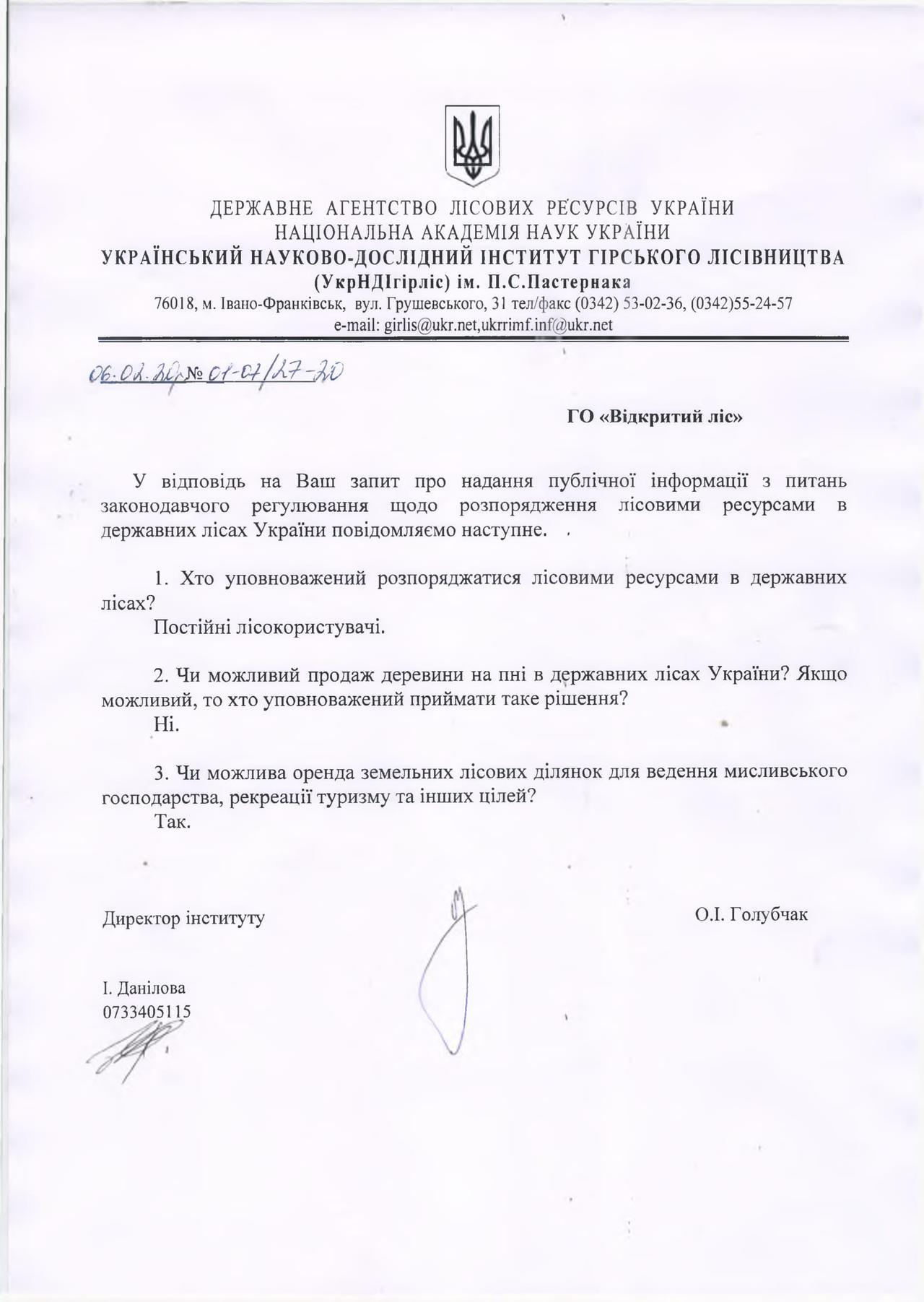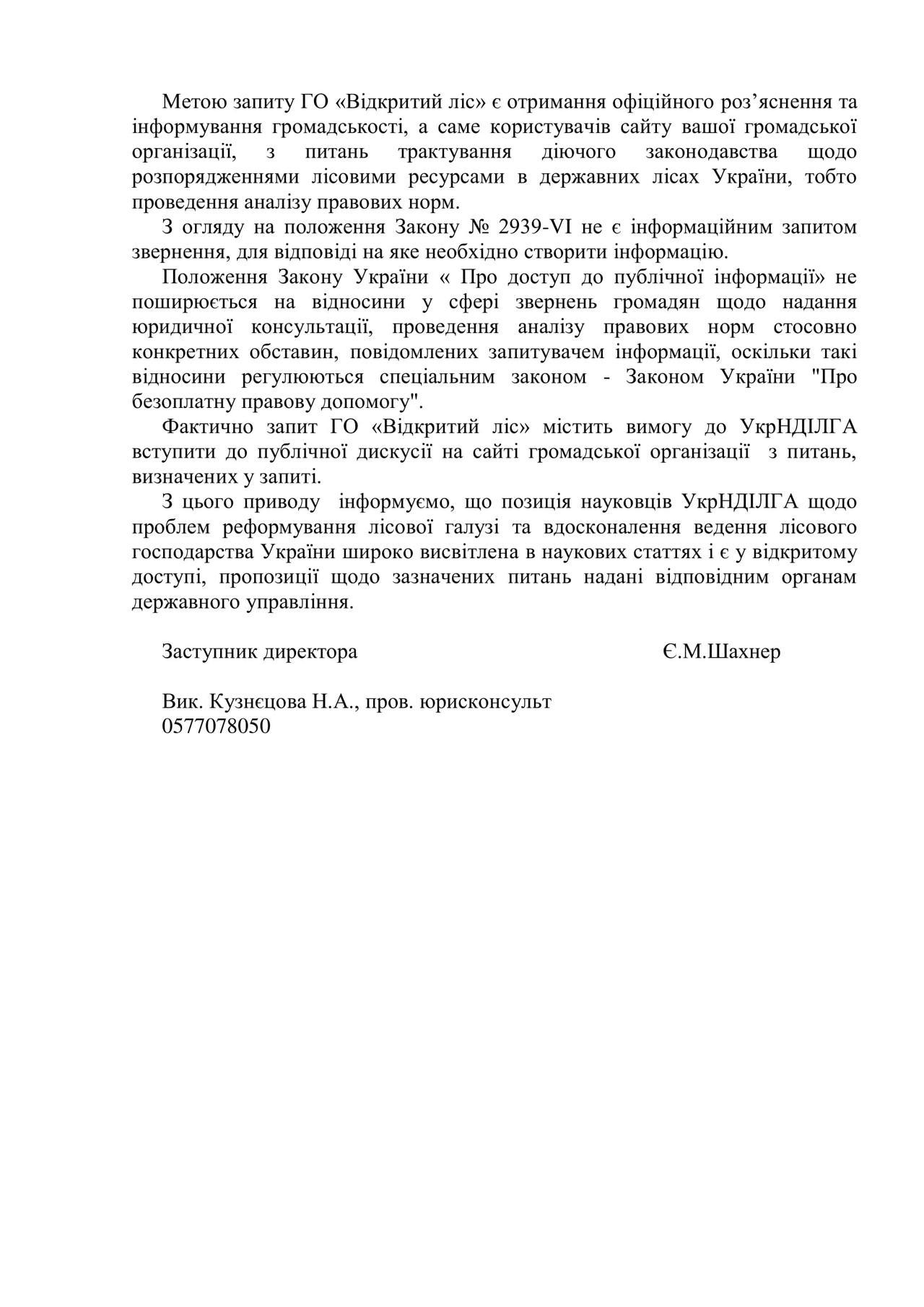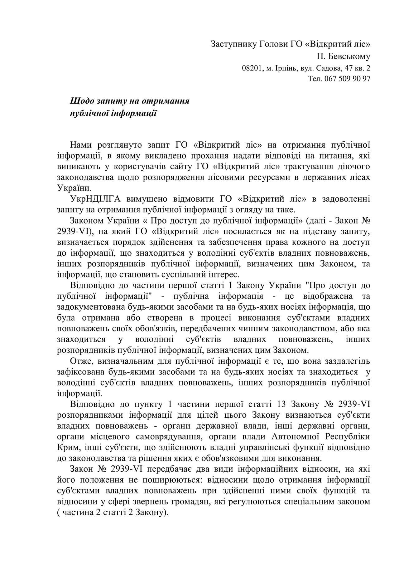 Відповідно до статті 20 Закону України «Про доступ до публічної інформації», просимо надати відповідь протягом 5 робочих днів з дня отримання запиту. Відповідь просимо надіслати на E-mail: openforest@ukr.net