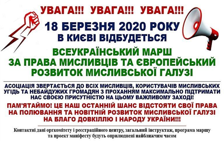 - ОРГАНІЗУВАТИ максимальну участь у проведенні Всеукраїнського маршу 18 березня 2020 року мисливців і користувачів мисливських угідь (нас має бути не менше п’яти тисяч);