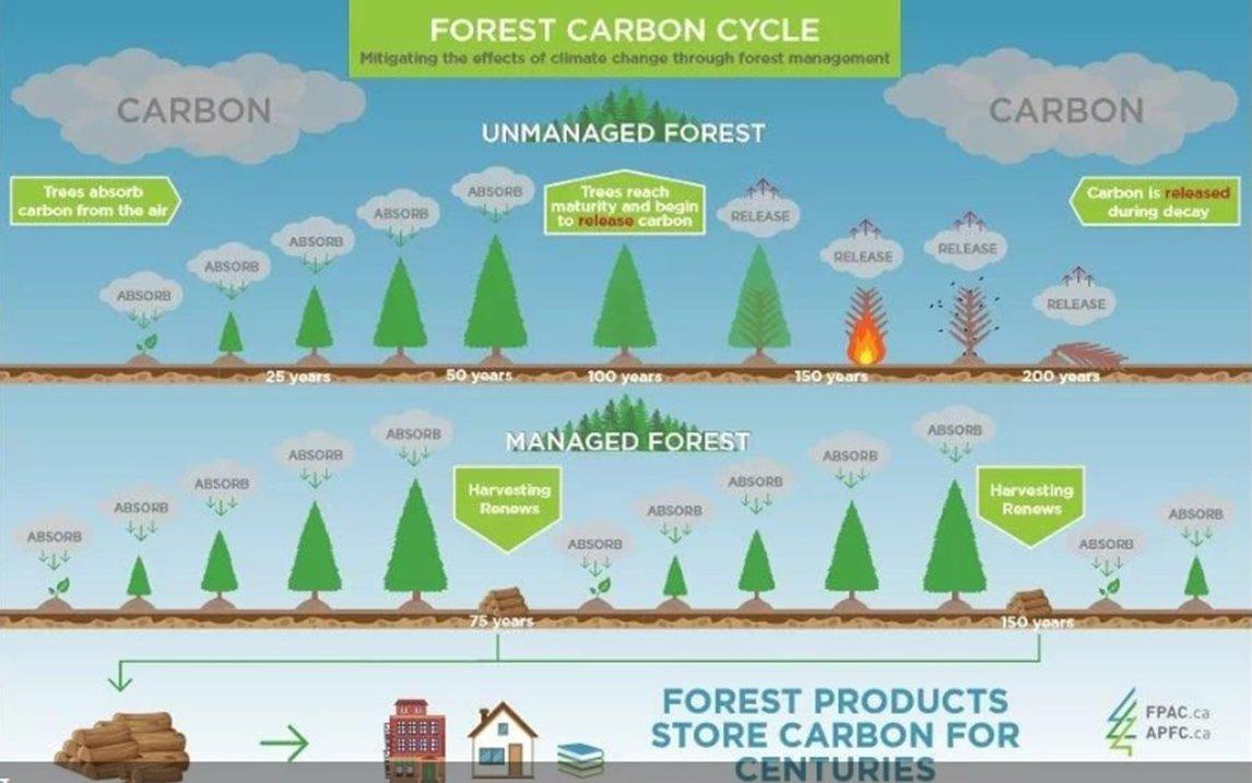 Що уряд та парламент могли б зробити для покращення? Сприяти популяризації деревини як конструкційного матеріалу. Адже використання деревини передусім для будівництва – це шлях до сповільнення кліматичних змін. В процесі росту дерева забирають з атмосфери вуглекислий газ (CO₂) та утримують вуглець (С) в деревині у зв’язаному стані. Якщо деревину не заготовляти, а залишити в лісі, то вона почне гнити (горіти) та виділяти вуглекислий газ в атмосферу. Цю ідею добре ілюструє інфографіка, розроблена Канадською асоціацією лісових продуктів (Forest Products Association of Canada (www.fpac.ca)