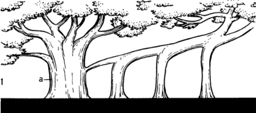 С течением времени корней-подпорок становится все больше, и за несколько десятков лет из одной особи может получиться целая баньяновая роща площадью десятки и сотни квадратных метров. Растение «шагнуло» во все стороны и вегетативно размножилось — но при этом осталось на месте.