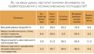 На правопорушення у лісомисливському господарстві найбільш істотно впливають: низька заробітна плата працівників лісомисливського господарства; недостатній контроль з боку лісової охорони і єгерської служби; високий рівень безробіття; недостатнє фінансування лісогосподарських і лісомисливських підприємств; бідність населення.