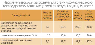 За результатами опитування найбільш вагомими загрозами для стану лісомисливського господарства, на думку фахівців, є: низька екологічна культура населення; недосконала законодавча база; погана охорона угідь; самовільне браконьєрське використання тваринного світу і мисливських угідь місцевими жителями; корупційні схеми перерозподілу мисливських угідь і при використанні мисливських ресурсів.