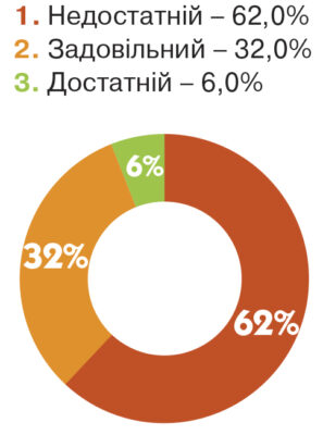 Середньомісячний розмір доходу опитуваних: 1000 грн – 8,8%, до 2000 грн – 39%, до 3000 грн – 41%, понад 3000 грн – 10 %.
