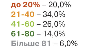 Стаж роботи у лісомисливському господарстві респондентів: до 3 років – 41,2%; 3–5 років – 21,6%, від 6–10 до 11–25 років – 35%.