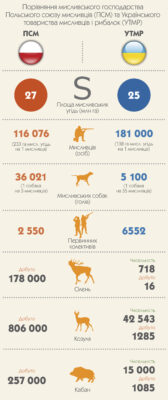 Площа становить 312 тис. кв. км, кількість населення 38,5 млн, з яких мисливців – понад 100 тис., що становить 0,26%. Для порівняння, Україна має удвічі більшу площу і утричі більше мисливців. І співвідношення мисливців до населення (43 млн) у нас теж вище за Польське – 0,7%. Отже, концентрація мисливців в Україні вища, ніж у Польщі, а от мисливське господарство перебуває у депресивному стані. У чому ж справа? Спробуємо розібратись.