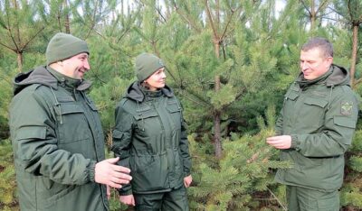 Лісничий Литовського лісництва Сергій Гордієнко, помічник лісничого Любов Карпенко і провідний інженер лісового господарства Віталій Гашута відзначають високий приріст соснових культур, створених з відбірного насіння клонових плантацій