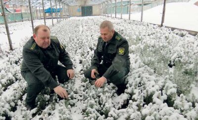 Головний лісничий лісгоспу Олександр Бугай (праворуч) і лісничий Охтирського лісництва Віктор Шукалович оглядають стан сіянців ялини у теплиці