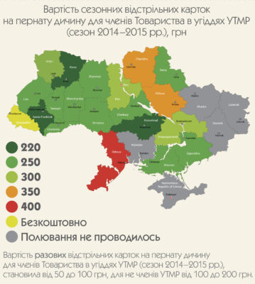 – Щодо вартості вступних внесків, то вони залишаються сталими по всій Україні впродовж останніх років і становлять: для рибалки – 80 грн, для мисливця – 150 грн. (на 2015 рік) Членські внески різняться залежно від області: від 150 до 400 грн/рік. (на 2015 рік) Ціна залежить від кількості угідь, які закріплені за облорганізацією, і чисельності членів, що входить до неї. Чим менше членів Товариства в області і більше угідь у користуванні, тим більші членські внески.