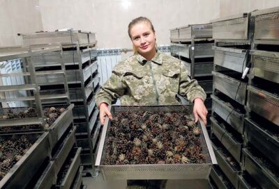 Лісник Олена Бурякова веде спостереження за розкриттям шишок сосни звичайної в сушильній камері